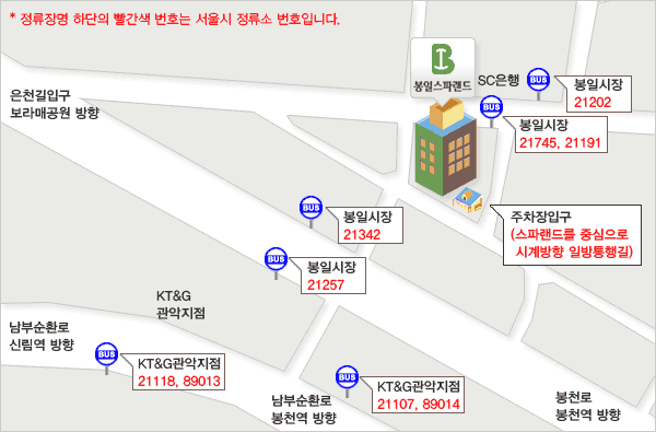 지선(G) 5524, 5535, 6511, 6516 | 봉일시장 앞 하차 보라매공원방면 (봉일시장 맞은편) |